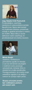 Predavateljica, coachinja, mentorica in ustanoviteljica portala Navdihni.me. Njeno delo temelji na intuitivnem pristopu, prisotnosti, sočutju in globoki povezavi z naravo ter živalmi. Skozi leta je razvila edinstven način coachinga, ki preobraža ljudi od znotraj navzven. Avtorica navdihujočih programov, ki posameznikom in skupinam pomagajo najti notranjo jasnost in avtentično moč vodenja.